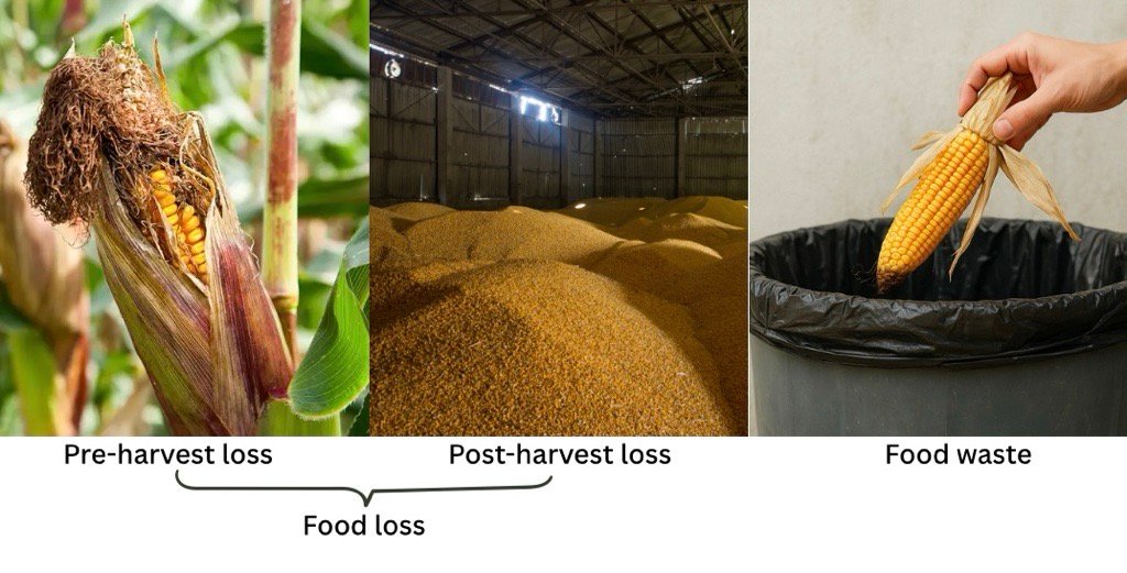Food loss is food removed from the supply chain after harvest but before retail, without being consumed or repurposed for productive uses such as animal feed, seed, or bioenergy. Food loss is categorized into Pre-harvest losses, which occurs on the farm, typically before harvest, and Post-harvest losses, which take place after harvest during handling, storage, processing and transportation, up until the food reaches the retail stage. In contrast, food waste occurs further down the value chain, after food reaches consumers, whether processed or unprocessed, and is primarily caused by retailers, food service providers, and/or consumers themselves.